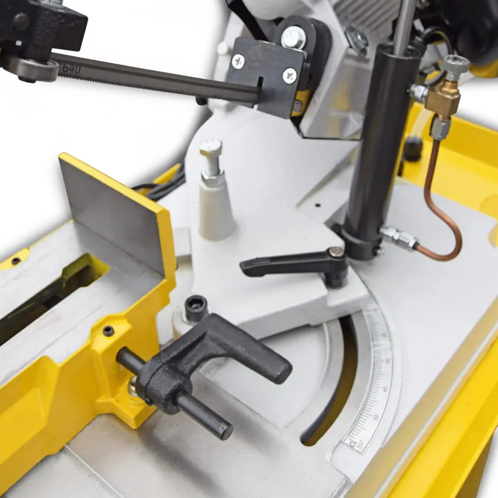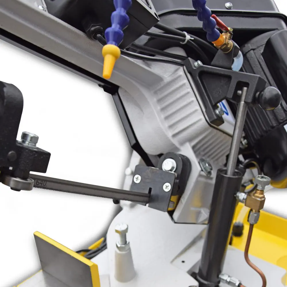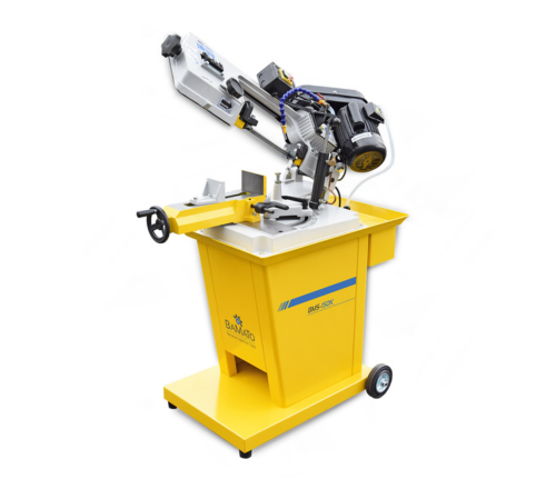 Die BAMATO Metallbandsäge BMS-150K ist serienmäßig mit einer Kühlmitteleinrichtung sowie einer stufenlosen, hydraulischen Absenkung des Sägebügels ausgestattet. Das Sägeaggregat ist bis 60° schwenkbar und hat 3 einstellbare Geschwindigkeiten mit automatischer Endabschaltung.