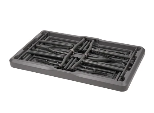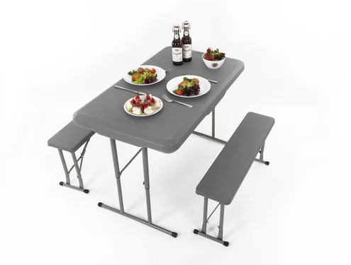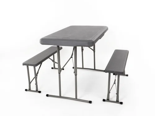 Garnitur besteht aus einem Tisch mit 2 Bänken. Diese werden zum Transport platzsparend in der Tischplatte fixiert.