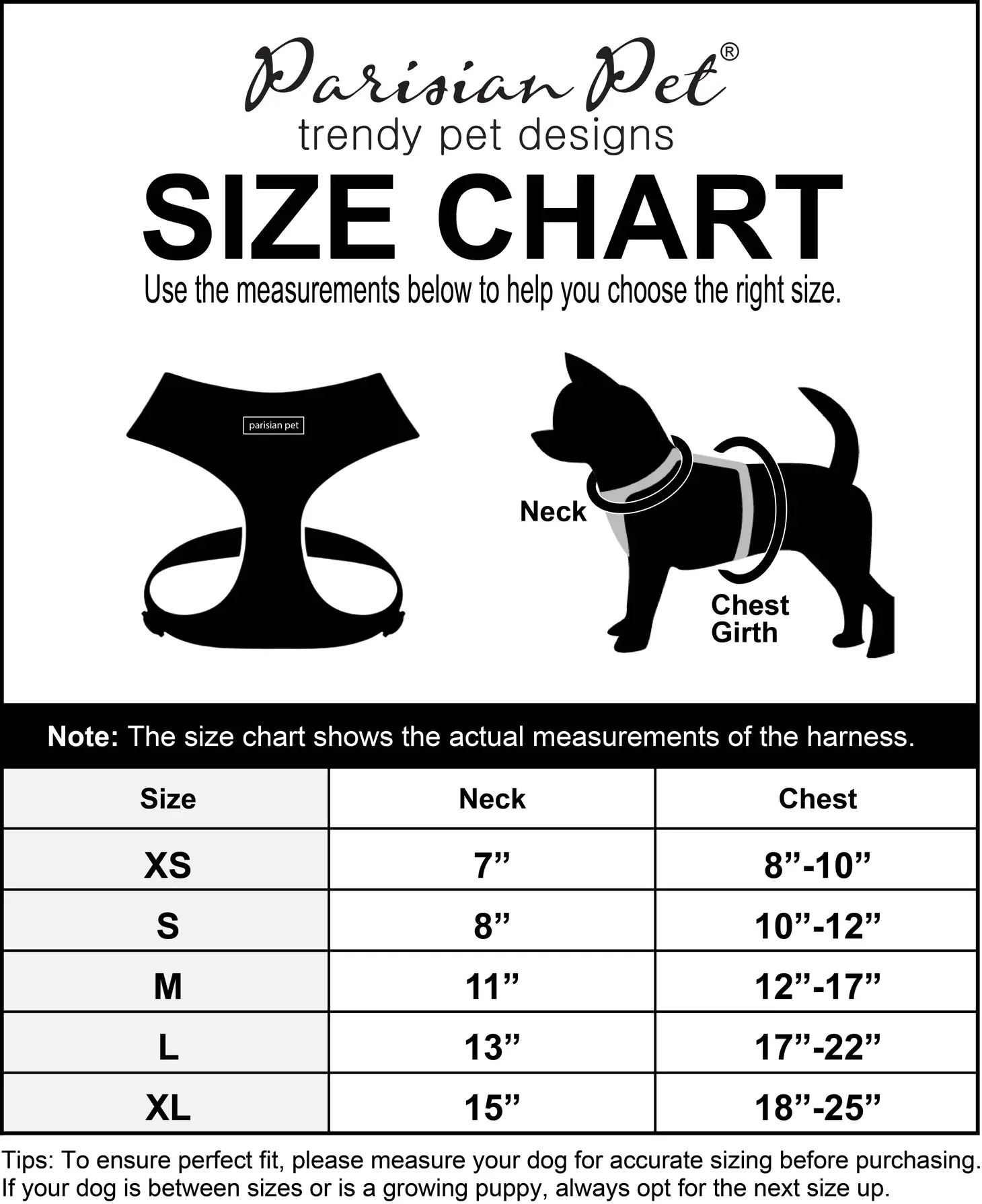 - In den Grössen S (Brustumfang 25 – 30cm) M (Brustumfang 30 – 43cm) L (Brustumfang 43 – 55cm) XL (Brustumfang 46 – 63cm)