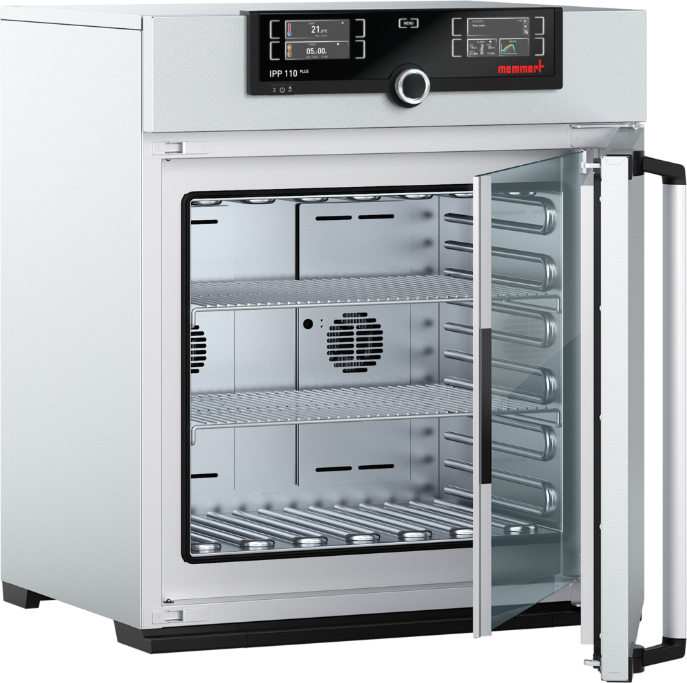 Peltier-Kühlbrutschrank IPP110ecoplus, TwinDISPLAY, 108 l, Arbeitstemperaturbereich ohne Licht 0 °C (mind. 20 °C unter Raumtemperatur) bis +70 °C, Arbeitstemperaturbereich mit Licht +10 °C bis +40 °C, Einstelltemperaturbereich 0 °C bis +70 °C, mit 2 Gitterrosten, äußere Edelstahltür, innere Glastür, Ethernet-Schnittstelle zum Auslesen der Protokolldaten; zusätzlich Übertragung von Programmen sowie Online-Protokollierung; USB-Port am ControlCOCKPIT für USB-Stick; Mehrfach-Über-/Untertemperaturschutz, integrierter Datenlogger mit Speicherkapazität für min. 10 Jahre, Einstellung von je 3 Kalibrierwerten am ControlCOCKPIT; Werkskalibrierzertifikat für +10 °C, +25 °C und +40 °C; Strukturedelstahlgehäuse: 745 x 864 x 555 mm; Edelstahlinnenraum: 560 x 480 x 400 mm; Spannung: 230 V/ 115 V, 50/60 Hz; max. Leistungsaufnahme: ca. 320 W