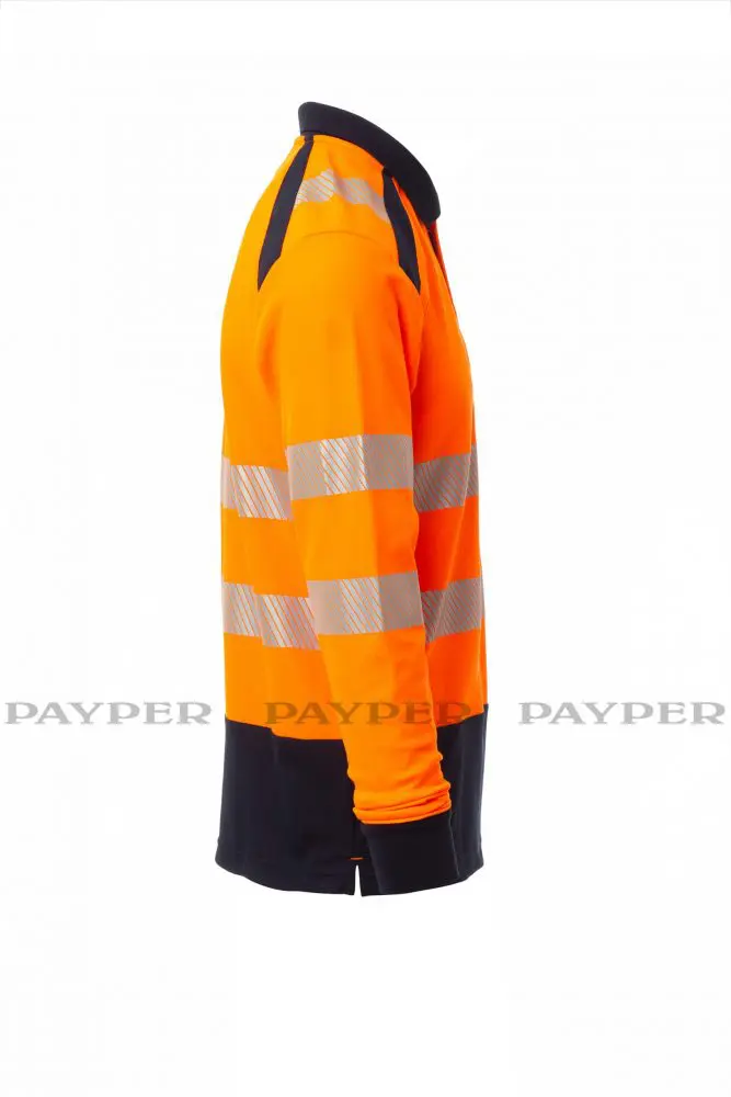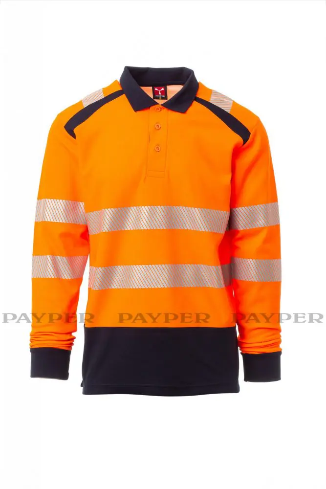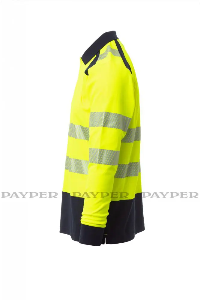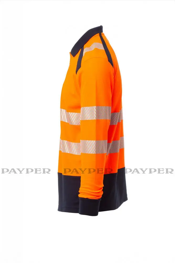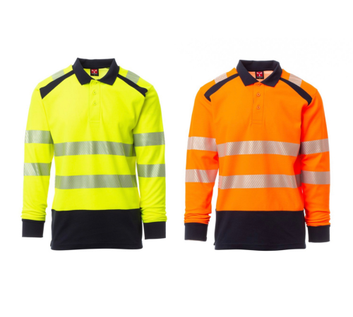 Poloshirt, langärmelig, zweifarbig, hohe Sichtbarkeit. Feinripp-Kragen mit 3 Knöpfen, verdeckte Nähte. Seitenschlitze. Segmentierte, heißversiegelte Reflexstreifen für eine gute Bewegungsfreiheit. Das Gewebe mit Baumwolle auf der Innenseite und Polyester auf der Außenseite sorgt für hohe Atmungsfähigkeit und Komfort, aber auch für eine lange Haltbarkeit.