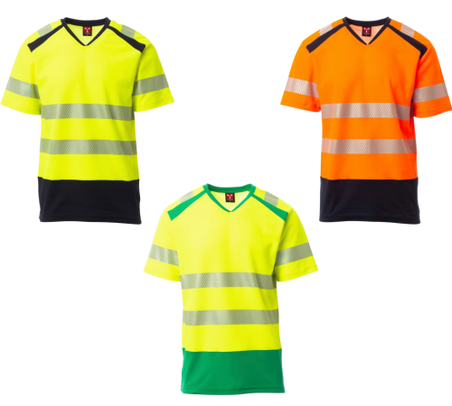 Kurzarm-T-Shirt mit V-Ausschnitt, zweifarbig, hohe Sichtbarkeit. Feinripp-Kragen, verdeckte Nähte. Segmentierte, heißversiegelte Reflexstreifen für eine gute Bewegungsfreiheit. Das Gewebe mit Baumwolle auf der Innenseite und Polyester auf der Außenseite sorgt für hohe Atmungsfähigkeit und Komfort, aber auch für eine lange Haltbarkeit.