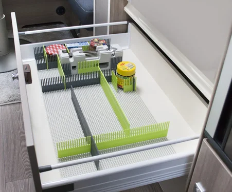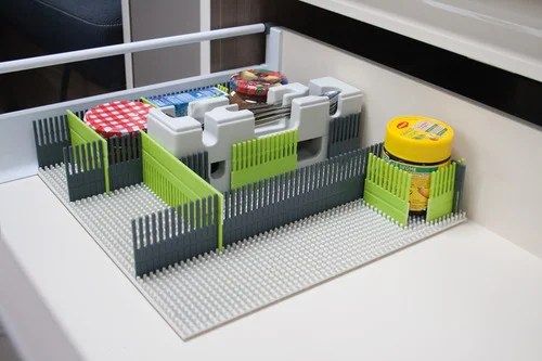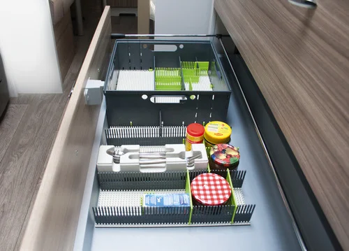 Bei Bedarf einfach an der Perforation zuschneiden und abklipsen. Super fexibel durch ihre Größenanpassung, platzsparend und somit für viele verschiedene – auch für schmalere – Schubladen- oder Staufächer, Transportboxen, Campingküchen, Schränke u.v.m. nutzbar.