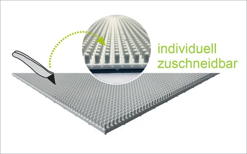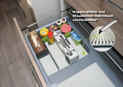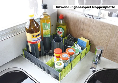 Tipp: Nutzen Sie am Besten immer eine Ant-Rutsch-Matte unter der Noppenplatte. Wenn Sie mehrere Noppenplaten nebeneinander legen verbinden Sie diese mit den Stauleisten. Dadurch entsteht eine große Ablagefäche.
