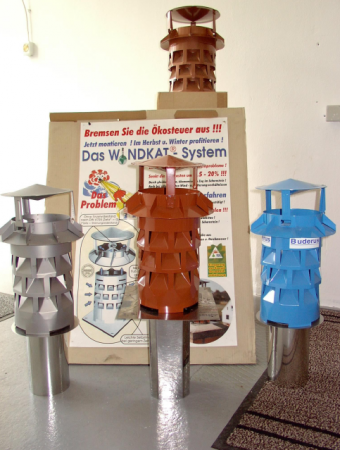 Jede Brennstelle, egal ob Gas, Öl oder Festbrennstoff, funktioniert mit dem Windkat-System optimal und hat günstige Verbrauchswerte, wenn das Heizsystem ideale Bedingungen im Schornstein vorfindet. Auch niedrige Abgastemperaturen erfordern optimale Schornstein- und Betriebsbedingungen: Bei ungünstigen Witterungsverhältnissen und Windeinflüssen muss die Heizanlage Schwerstarbeit leisten, um den witterungsbedingten Überdruck im Schornstein (Rauchrohr) zu überwinden. Das Windkat-System sitzt genau in dieser kritischen Zone und sorgt durch seine Injektionsdüsen für optimalen Zug im Schornstein. So wird der Strömungswiderstand aufgehoben und kostbare Energie gespart. |
